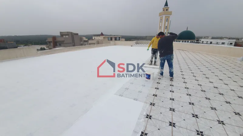 ## Système SELF 60 Horizon Chimique — Protection Durable pour un Établissement de Santé **Localisation :** Hôpital Kassab, Tunisie **Système utilisé :** SELF 60 — Étanchéité Liquide Horizon Chimique **Applicateur agréé :** SDK Batiment **Garantie :** 10 ans --- ## Introduction La protection des toitures terrasses d'un établissement hospitalier est un défi technique majeur. Les contraintes sont multiples : continuité de service, surfaces importantes, exposition aux intempéries et exigences sanitaires strictes. Pour l'Hôpital Kassab en Tunisie, SDK Batiment — applicateur agréé Horizon Chimique — a mis en œuvre le système d'étanchéité liquide SELF 60, une solution certifiée offrant une protection optimale et une garantie de 10 ans. --- ## Présentation du Système SELF 60 Le système **SELF 60 d'Horizon Chimique** est une solution d'étanchéité liquide bicouche armée par un voile géotextile. Il protège efficacement les toitures terrasses contre les infiltrations d'eau tout en formant une membrane élastique durable. ### Composition du système (5 produits) : - **HPE** — Primaire d'accrochage haute performance - **HORIFLEX 110** — Mastic élastique étanche pour joints - **HORIFLEX 100** — Mastic élastique de renforcement - **HORI ÉTANCHE** — Étanchéité liquide monocomposant - **Armature géotextile** — Fibre de renforcement --- ## Les 8 Étapes de Mise en Œuvre ### Étape 1 — Grattage et nettoyage du support Décapage complet de l'ancienne étanchéité et nettoyage minutieux de la surface pour garantir une parfaite adhérence du nouveau système. ### Étape 2 — Ouverture des joints de dilatation Traitement des joints de dilatation à la meuleuse pour préparer leur remplissage et éviter toute fissuration future. ### Étape 3 — Application du primaire d'accrochage HPE Application du primaire **HPE** sur l'ensemble du support. Cette couche essentielle assure l'adhérence parfaite du système d'étanchéité sur le béton. ### Étape 4 — Fermeture des joints au mastic HORIFLEX 110 Remplissage de tous les joints de dilatation avec le mastic élastique étanche **HORIFLEX 110**, garantissant une étanchéité totale même en cas de mouvements structurels. ### Étape 5 — Collage des fibres géotextiles avec HORI ÉTANCHE Application de la première couche d'**HORI ÉTANCHE** et incorporation immédiate de l'armature géotextile pour renforcer la membrane et prévenir les fissurations. ### Étape 6 — Deuxième couche d'HORI ÉTANCHE sur fibre Application d'une deuxième couche d'étanchéité liquide **HORI ÉTANCHE** directement sur les fibres géotextiles pour une protection renforcée. ### Étape 7 — Renforcement des intersections au HORIFLEX 100 Traitement de tous les angles et intersections entre les fibres avec le mastic élastique **HORIFLEX 100** pour éliminer tout point de faiblesse. ### Étape 8 — Couche de finition HORI ÉTANCHE Application de la troisième et dernière couche d'**HORI ÉTANCHE** comme couche de finition, offrant une surface lisse, résistante aux UV et aux fortes chaleurs estivales tunisiennes. --- ## Avantages du Système SELF 60 pour l'Hôpital Kassab ### ✅ Garantie 10 ans Le système SELF 60 appliqué par un applicateur agréé Horizon Chimique offre une garantie fabricant de **10 ans**, assurant la tranquillité d'esprit de l'établissement hospitalier. ### ✅ Réduction de la chaleur Le système contribue significativement à **réduire la température intérieure**, un avantage considérable pour le confort des patients et la consommation énergétique de l'hôpital. ### ✅ Application en toutes saisons Le système SELF 60 peut être appliqué même par **forte chaleur estivale**, ce qui est particulièrement adapté aux conditions climatiques tunisiennes. ### ✅ Eau de récupération propre Une particularité remarquable : les eaux de ruissellement récupérées sur les surfaces traitées restent **propres et conformes aux normes alimentaires** (Alimentaire), un atout majeur pour un établissement de santé. ### ✅ Application sur supports difficiles Le système adhère parfaitement sur tous types de supports, même les plus **dégradés ou complexes**. --- ## Résultats et Impact Grâce à l'intervention de **SDK Batiment**, applicateur agréé Horizon Chimique, l'Hôpital Kassab bénéficie désormais : - D'une **toiture terrasse étanche et durable** pour 10 ans minimum - D'une **réduction notable de la température** dans les services - D'une **protection totale** contre les infiltrations et les dégâts des eaux - D'une **conformité aux normes sanitaires** les plus strictes --- ## Pourquoi Choisir SDK Batiment ? **SDK Batiment** est le distributeur officiel et applicateur agréé des produits **Horizon Chimique** en Tunisie. Notre expertise couvre : - Étanchéité de toitures terrasses accessibles et inaccessibles - Imperméabilisation de piscines et réservoirs - Protection des fondations et sous-sols - Isolation thermique ### Nos références prestigieuses : Hôpital Charles Nicolle, Hôpital Kassab, Siège BIAT, Siège BNA, Club Med Djerba, LEONI, COFICAB et bien d'autres. --- ## Contactez-Nous pour Votre Projet Vous avez un projet d'étanchéité toiture, terrasse ou piscine ? 📞 **+216 53 520 222** 🌐 **sdkbatiment.com** 📍 **Sousse, Tunisie — Intervention dans toute la Tunisie** **Devis gratuit et sans engagement !** --- *SDK Batiment — Applicateur Agréé Horizon Chimique | Système SELF 60 | Garantie 10 ans | Tunisie*