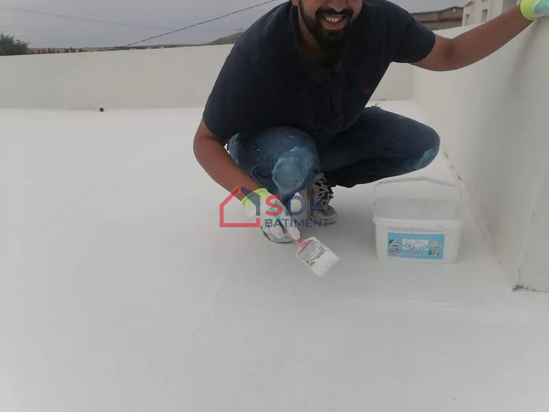 Travaux Étanchéité SOUSSE Préparation : Nettoyage complet, décapage de l'ancien support et traitement des fissures au mastic polyuréthane. Primaire : Application d’une couche d’imprégnation (EIF) pour l'adhérence. Étanchéité : Pose d'une membrane bitumineuse 4mm renforcée (soudée à chaud) avec relevés d'étanchéité sur les acrotères. Points Singuliers : Étanchéité des évacuations d'eau pluviale et des sorties de tuyaux. Finition : Protection anti-UV et test de mise en eau (24h-48h). 🙂